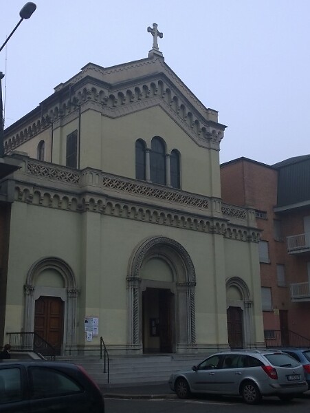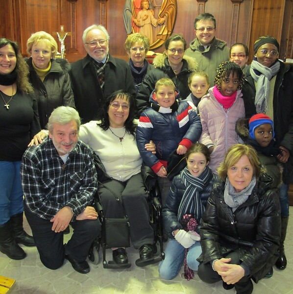 Bild: Alpidio Balbo mit dem Pfarrer Roberto Populin und einigen Freunden der Pfarrgemeinschaft von Turin, sowie die Kirche Santa Croce
