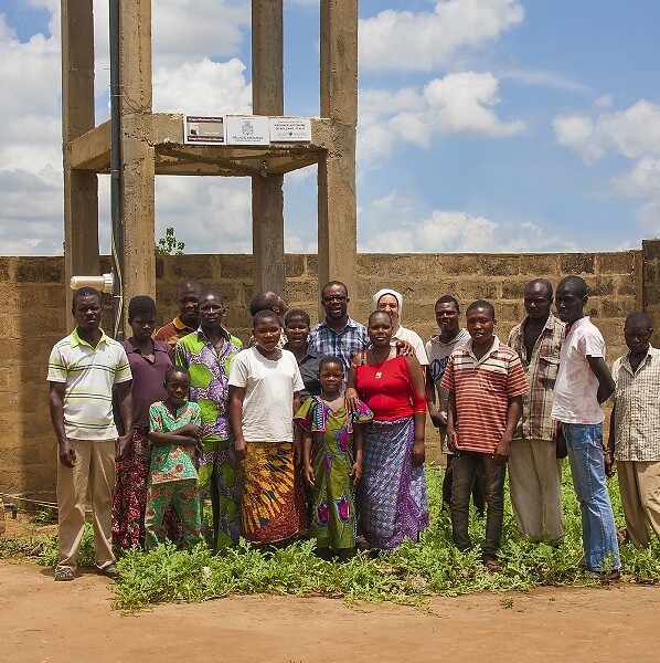 Bild: Einige Patienten und Angestellte des „Oasis d‘Amour“ von Tokplie vor dem neuen Wasserturm