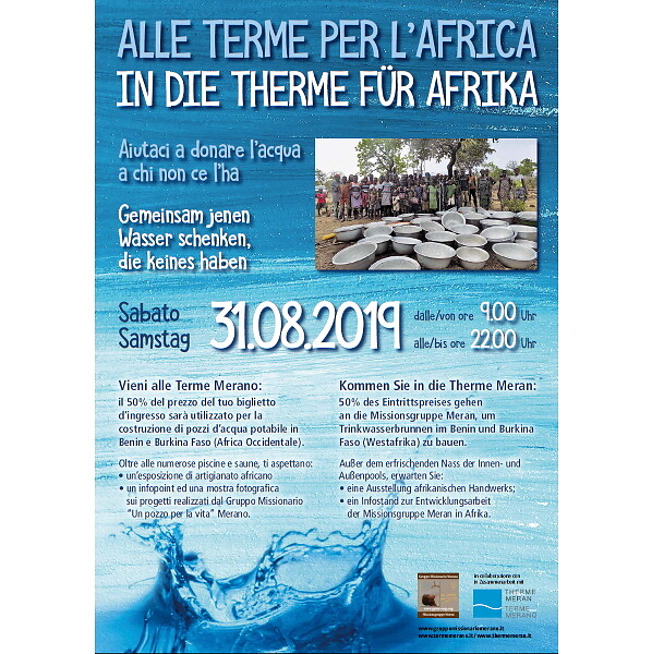 Auch in diesem Jahr, können die Besucher am Samstag, den 31. August, mit ihrem Aufenthalt in der Therme Meran dazu beitragen, diese Projekte weiterzuführen. Die Hälfte des Eintrittspreises an diesem Tag wird für die Erschließung von neuen Trinkwasserbrunnen verwendet. Zudem werden im Eingangsbereich der Therme eine Ausstellung Afrikanischen Handwerks, ein Infostand und eine Fotoausstellung zu den umgesetzten Projekten der Missionsgruppe zu sehen sein.