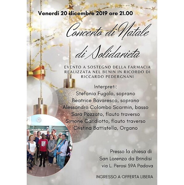 Am Freitag den 20. Dezember 2019 findet um 21.00 Uhr in der San Lorenzo da Brindisi Kirche von Padua (Via Perosi 59/A) erneut das nunmehr zur Tradition gewordene Weihnachtskonzert in Gedenken an Riccardo Pedergnani statt. Der junge Apotheker ist im Jahr 2010 verstorben und in seinem Gedenken ist die Apotheke im Krankenhaus „St. Padre Pio“ von N‘Dali, die auch seinen Namen trägt, verwirklicht worden.