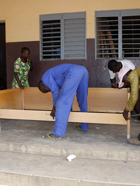 Die Betten sind letzten Herbst vom GMM mit einem Container verschifft worden und dieser Tage in dem von den Schwestern "Petites servantes des pauvres" geführten Zentrum angekommen. Beim Entladen und Montieren hat auch Fabrizio Arigossi, der Projektleiter des GMM, der sich zur selben Zeit im Benin aufgehalten hat, mitgeholfen. Die neuen Möbel machen die Räume, in denen 30 bis 40 Jugendliche untergebracht werden, wesentlich wohnlicher.