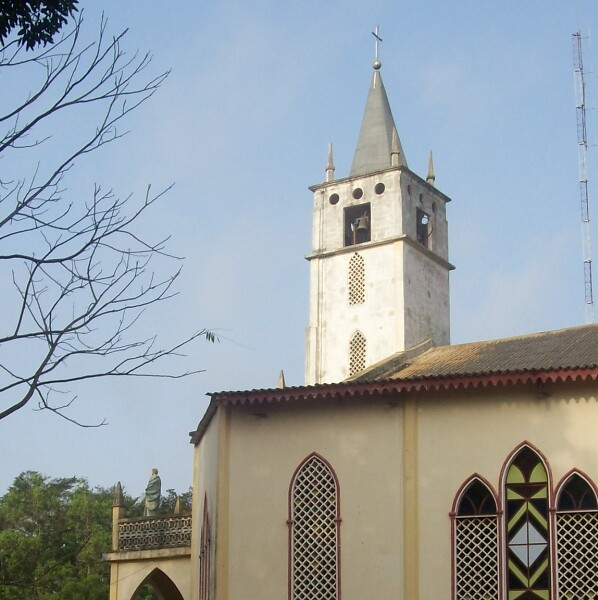 Foto: die Pfarrkirche von Tabligbo mit dem alten Masten im Hintergrund.