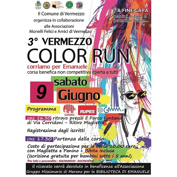 In Vermezzo, einer Ortschaft in der Nähe von Mailand, findet wieder der „Color run“ für Emanuele Combi statt, dem Jungend der allzu früh verstorben ist und nach dem die Bibliothek in der Oberschule von Kouande, im Benin, benannt wurde. Die Veranstaltung findet am Samstag, den 9. Juni um 16.30 Uhr statt. Organisiert wird sie von der Gemeindeverwaltung von Vermezzo in Zusammenarbeit mit den Vereinen „Monelli felici“ und „Amici di Vermezzo“.