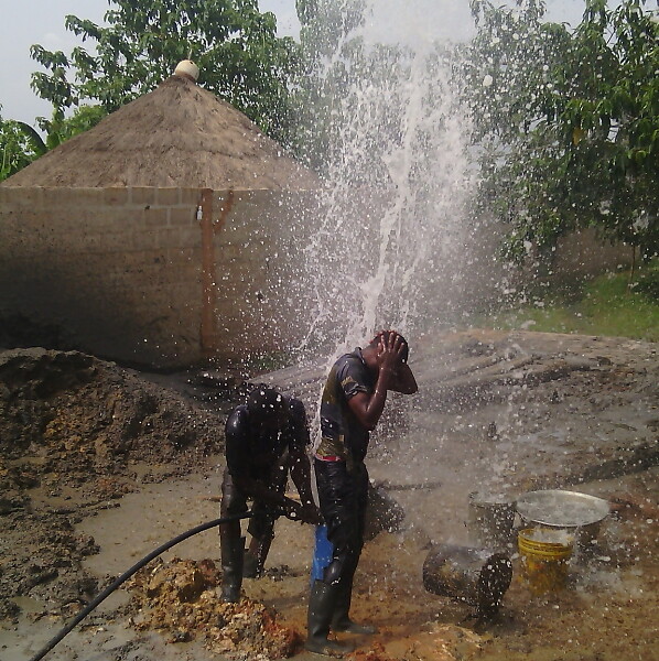 Zu erleben, wie auf einmal Wasser aus dem Boden schießt, ist sicher der aufregendste Moment einer Brunnenbohrung. Die Technik ist inzwischen ausgereift, und es gibt kaum noch Überraschungen, aber es ist doch jedes Mal ein befriedigendes Gefühl, die ersten Wasserfontänen aus dem Bohrloch hüpfen zu sehen. Umso mehr, wenn man bedenkt, dass dieses, durch das jährliche Bohrprogramm der Meraner Missionsgruppe „ein Brunnen zum Leben“ bereitgestellte Wasser, die Lebensbedingungen vieler Menschen im Benin verbessert.