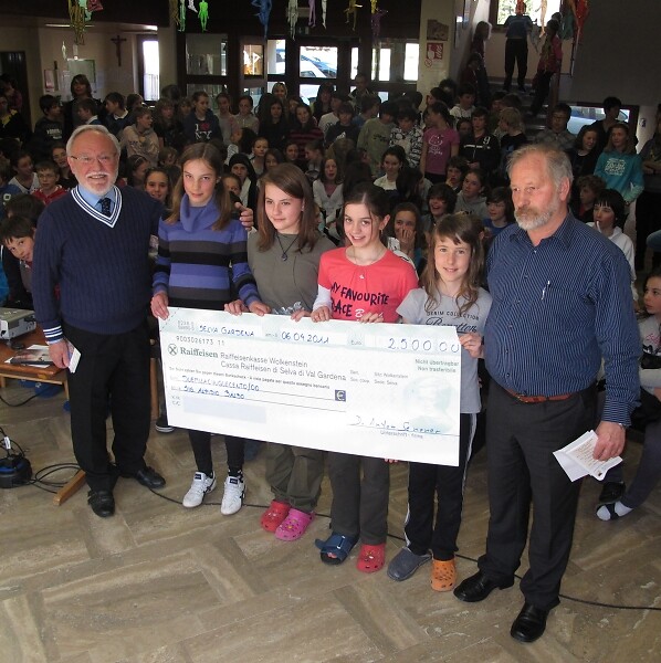 185 étudiants et tous les professeurs de l'école de Selva Gardena dirigée par le prof. Anton Senoner ont participé au projet de solidarité pour l'Afrique. Avant Noël (voir la nouvelle du 23 décembre 2010), avec la collaboration du professeur Maria Cristina Senoner, une fête avec récitations et chants et un marché de bienfaisance avaient été organisés et Alpidio Balbo y était intervenu. Le président honoraire du GMM accompagné de Giovanni Rizzi et du responsable des projets, Fabrizio Arigossi, est retourné à Selva aujourd'hui pour y rencontrer les étudiants dans leur école. Les représentants du GMM, après la projection du film “la via della speranza” (la voie de l'espoir) ont présenté les projets et l'activité de l'association. A la fin du rendez-vous, les étudiants ont remis à Alpidio Balbo un chèque de 2.500 euros avec lesquels ils contribueront à la construction d'un puits au Bénin.