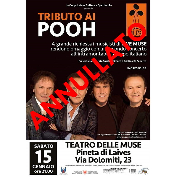 Le concert, “Tributo ai Pooh”, qui aurait dû avoir lieu le 15 janvier 2022 à 21h, au théâtre delle Muse de Pineta di Laives (Bz) a été reporté. La décision a été prise par Live Muse, l’organisateur de la soirée dont les bénéfices auraient été dévolus aux activités du GMM “Un puits pour la vie”.