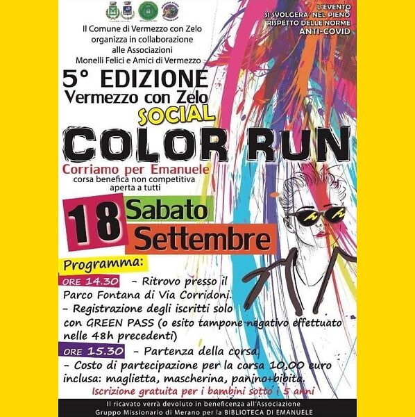 Elle n’a pas eu lieu l’année dernière à cause de la pandémie, mais la “Color run” est de retour à Vermezzo con Zelo, aux portes de Milan, une course de bienfaisance non compétitive en mémoire d’Emanuele Combi, ce jeune du village de Lombardie décédé prématurément auquel a été dédié la bibliothèque de l’école secondaire construite par le GMM “Un puits pour la vie” à Kouande, au Bénin.