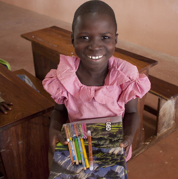 La joie que révèle son large sourire est sans doute due à ce cadeau inattendu, à ces "petites choses" dont elle et les autres enfants de Bembéréké disposent rarement. Quelques cahiers et stylos de couleur sont un petit trésor pour ces élèves qui viennent de petits villages où tout manque.