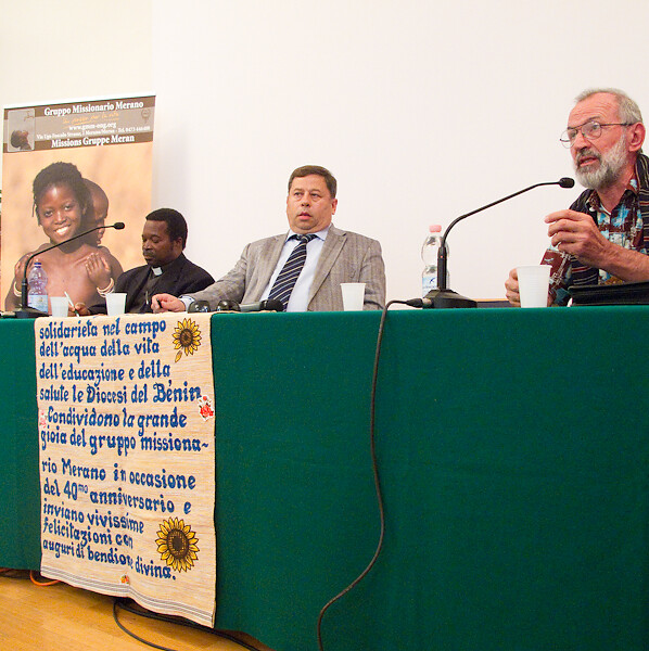 Témoignages d’Afrique au Pavillon des Fleurs de Merano, pour la rencontre organisée dans le cadre de l’exposition sur les 40 ans d’engagement missionnaire de Alpidio Balbo et du Groupe Missionnaire "Un puits pour la vie" Merano. A la rencontre sont intervenus Mons. Eugène Cyrille Houndékon, Secrétaire de la Conférence épiscopale du Bénin et archevêque de Abomey et Frère Florent Priuli, directeur et chirurgien de l’hôpital "St. Jean de Dieu" de Tanguieta.