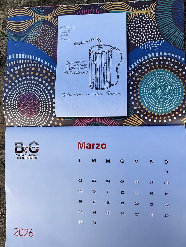 Les bénéfices de la vente du calendrier de solidarité 2026 permettront d’acheter deux motos tricycles destinées à accompagner les enfants à l’école. Selon l’association de Borgagne, village historique du Salento, les enfants d’Ouenou ont voulu partager un aperçu de leur vie au Bénin à travers leurs dessins, illustrant monuments, personnages, moyens de transport et objets du quotidien. Leurs œuvres traduisent aussi la façon dont ils imaginent notre monde occidental : grâce à leur créativité, ils tissent un lien entre des univers qui semblent éloignés, rêvant de traverser ce pont, un jour, pour nous rencontrer.