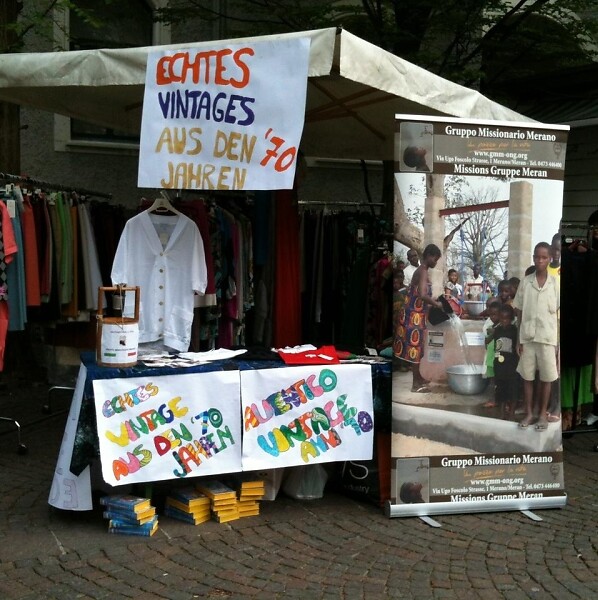 Con l'obiettivo di raccogliere fondi a sostegno del Gruppo Missionario "Un pozzo per la vita" Merano, Cecilia, Elisabetta e Maria Luise hanno allestito un banchetto in Piazza del Grano a Merano, mettendo in vendita capi d'abbigliamento di moda qualche anno fa che hanno suscitato la curiosità di molti passanti. Le tre amiche, alle quali va il nostro ringraziamento, hanno distribuito anche materiale informativo sull'attività del GMM.