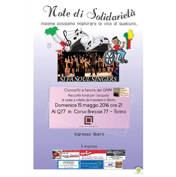 "Insieme possiamo migliorare la vita di qualcuno": è la convinzione da cui prende spunto il concerto di solidarietà del coro "Si Fa Soul Singers" di Torino a favore del Gruppo Missionario "Un pozzo per la vita". L'iniziativa è in programma domenica 15 maggio 2016, alle ore 21, presso il Q77 in Corso Brescia 77 a Torino.