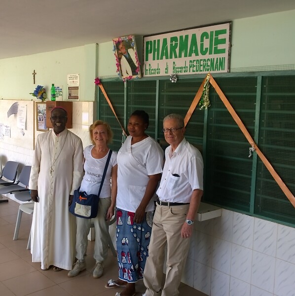 Nella foto: i genitori di Riccardo Pedergnani, Nicoletta e Roberto insieme al vescovo di N'Dali, mons. Martin Adjou, e la responsabile della farmacia.