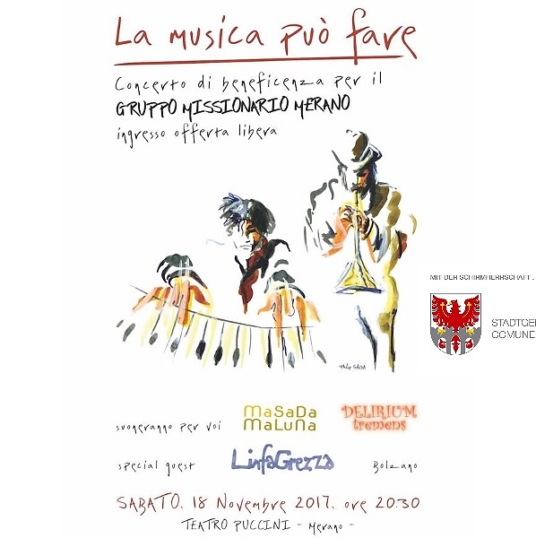 La serata, organizzata con il patrocinio del Comune di Merano, sarà, come l'edizione dello scorso anno, una vera e propria festa della musica e della solidarietà animata dai gruppi musicali meranesi "Masada Maluna" e "Delirium Tremens" e, quali ospiti d'onore, dai "LinfaGrezza " di Bolzano.