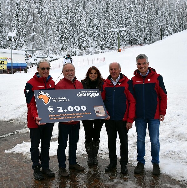 Il presidente Georg Weissensteiner, l’amministratore delegato Siegfried Pichler e il direttore della comunicazione Thomas Ondertoller della Obereggen Latemar Spa, hanno consegnato un assegno di 2mila euro a Alpidio Balbo, presidente onorario del GMM, e a Mirella Leoni, socia del GMM. La somma è il frutto di una donazione della stessa società impianti e delle offerte raccolte fra i frequentatori delle piste con un simpatico vaso della fortuna e contribuirà alla realizzazione di un pozzo per l'acqua otabile, alimentato da un impianto fotovoltaico, in Benin. "Per questo motivo, come società impianti, abbiamo deciso di contribuire al progetto del GMM", ha spiegato Weissensteiner. Balbo, ringraziando gli organizzatori, ha sottolineato che "la garanzia dell’acqua, per una parte degli abitanti del Benin, vuole costituire, attraverso questo progetto, la concreta possibilità per un futuro meno buio di quello attuale".